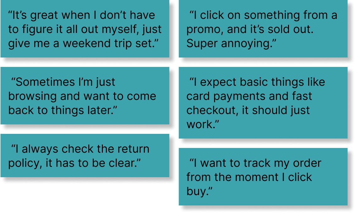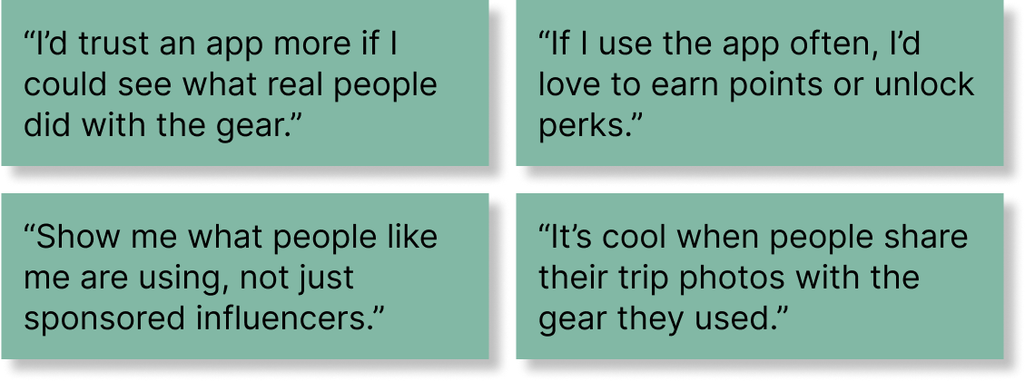 To better understand the needs and behaviors of potential users, I conducted a small round of informal qualitative research with friends and family. The goal was to gather honest feedback about their camping habits, preferences, frustrations, and how they currently shop for outdoor gear. This early insight helped shape the foundation for user personas and initial feature priorities in the Campera app.