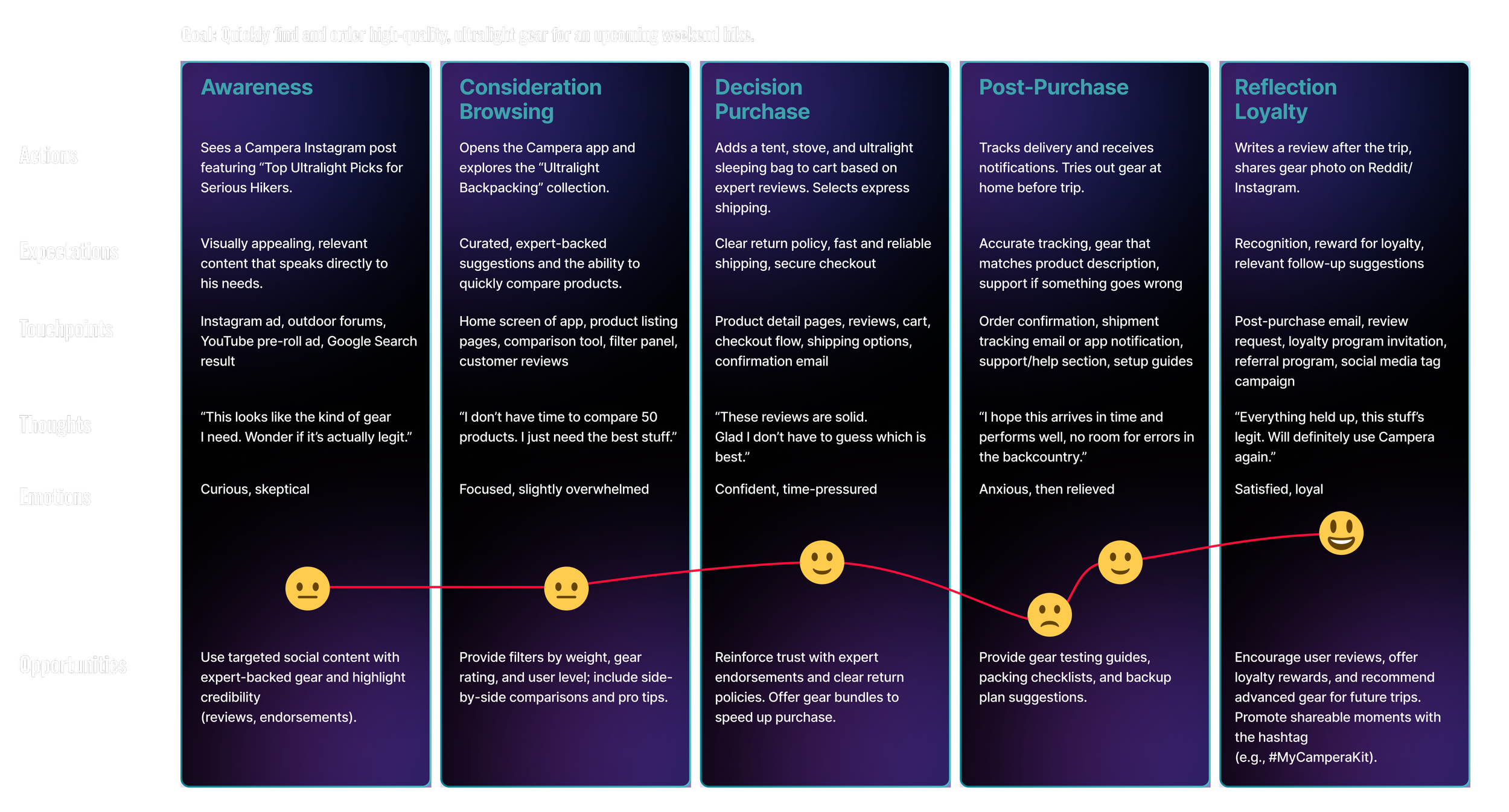 Discovery & Curiosity: Product recommendations and content encourage trying new experiences, whether that’s glamping, backpacking, or weekend hiking.