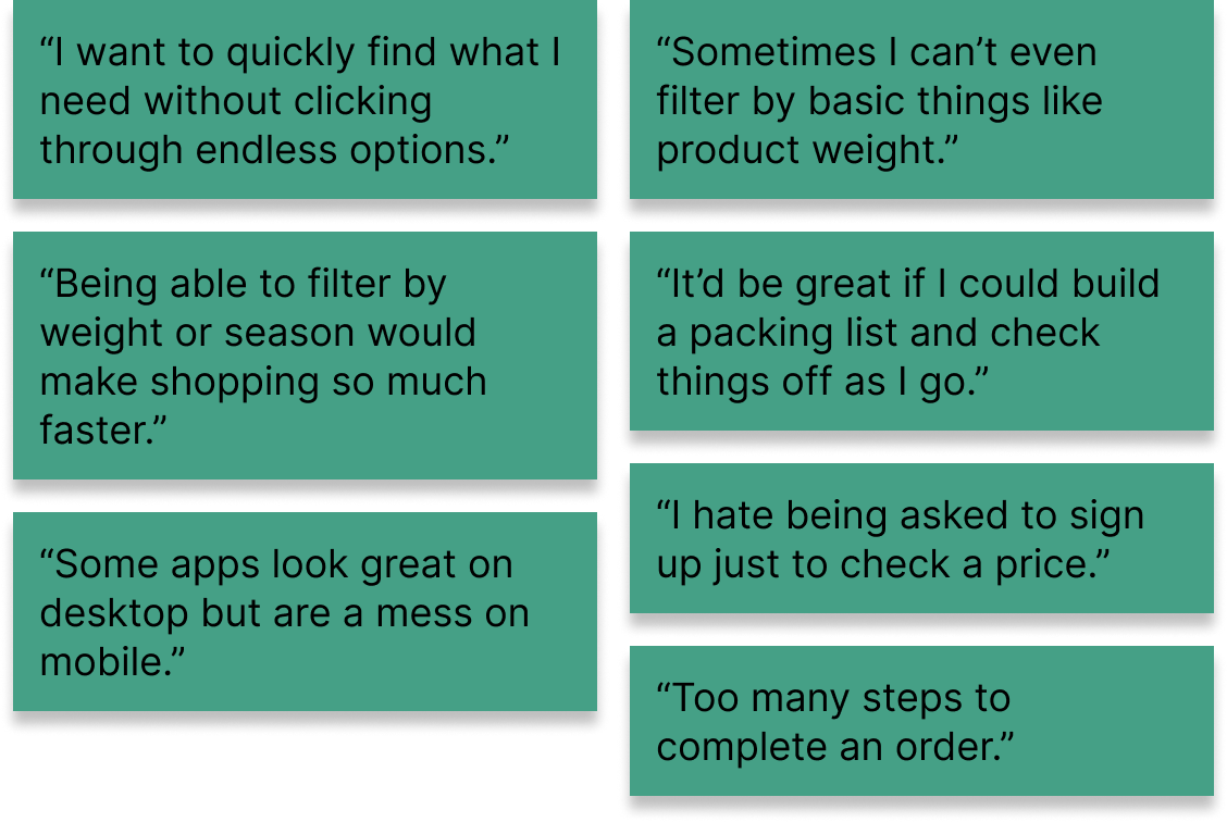 I conducted research and analyzed five similar applications and websites offering outdoor and camping gear. I categorized them as both direct and indirect competitors, and reviewed their structure, user flow, and customer feedback. Based on these observations, I developed the following insights.