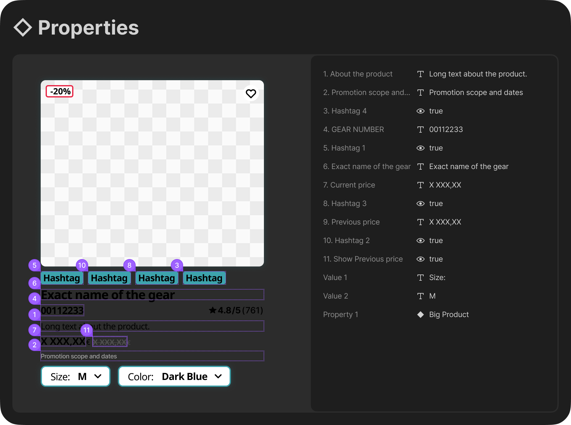 A key part of this work was setting up and managing component properties, which turned out to be one of the most powerful and time-saving tools. I applied different property types such as: